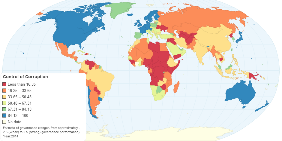 This map shows "Control of Corruption", a dimension of governances in Worldwide Governance Indicators (WGI) project by World Bank Group, which reflects perceptions of the extent to which public power is exercised for private gain, including both petty and grand forms of corruption, as well as "capture" of the state by elites and private interests.