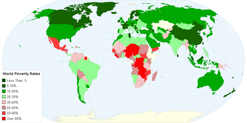 World Countries poverty rates, some small islands did not have data, so there is just a 0