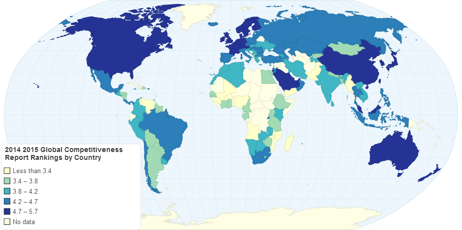 Access the rankings of top 100 countries in the Global Competitiveness Index (GCI) in 2014-2015. Higher Value means Higher Competivenes Index. On the map, Switzerland has the highest value - 5.7, Guinea - lowest, with 2.8 index value.