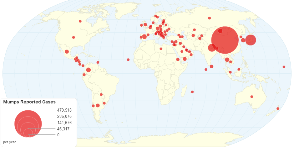Mumps, also known as epidemic parotitis, is a viral disease caused by the mumps virus. Initial signs and symptoms often include fever, muscle pain, headache, and feeling tired. This is then usually followed by painful swelling of one or both parotid glands.Symptoms typically occur 16 to 18 days after exposure and resolve after 7 to 10 days.Symptoms in adults are often more severe than in children.About a third of people have mild or no symptoms.Complications may include infections of the coverings of the brain (15%), pancreatitis (4%), permanent deafness, and painful testicular swelling which uncommonly results in infertility.Women may develop ovarian swelling but this does not increase the risk of infertility.