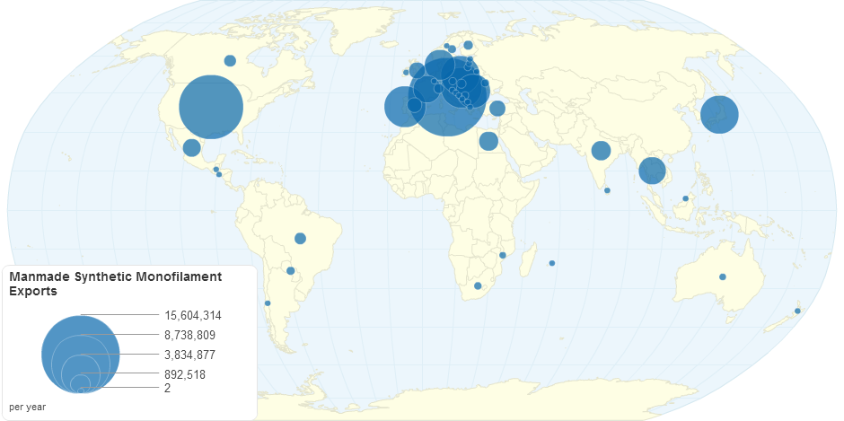 This chart shows manmade synthetic monofilament export quantity details by country.