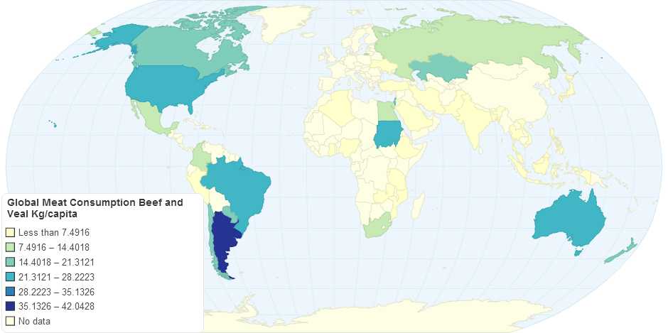 Uruguay is in definite lead with the highest beef and veal consumption per capita, followed by Argentina and Brazil. According to the data from OECD, averagely each Uruguayan people ate over 42 kg beef or veal in 2014, representing the highest beef veal consumption per capita in the world. In comparison, each American people only ate nearly 24 kg beef or veal in the same year, while African countries such as Mozambique, Ghana and Nigeria consumed the least beef or veal per capita.