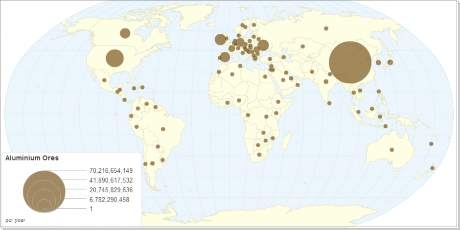 This chart shows aluminium ores import and export by country.