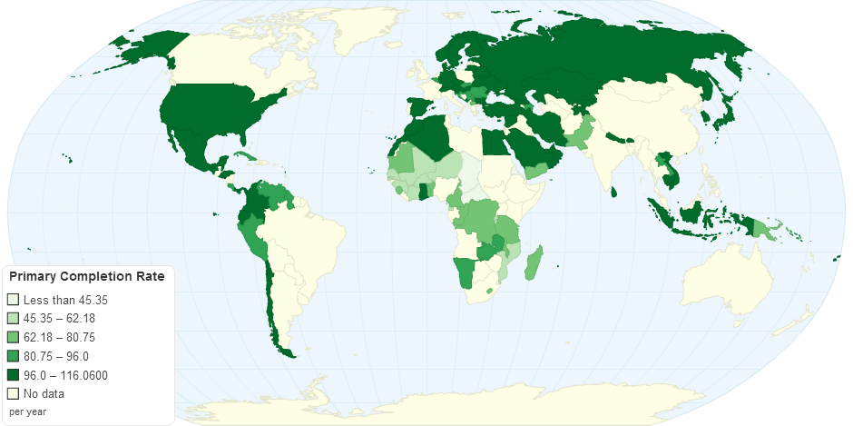 Primary completion rate, or gross intake ratio to the last grade of primary education, is the number of new entrants (enrollments minus repeaters) in the last grade of primary education, regardless of age, divided by the population at the entrance age for the last grade of primary education. Data limitations preclude adjusting for students who drop out during the final year of primary education.