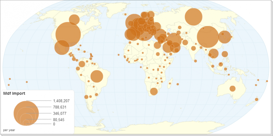 This chart shows MDF (Medium-density fibreboard) import and export details by country. Medium-density fibreboard (MDF) is an engineered wood product made by breaking down hardwood or softwood residuals into wood fibres, often in a defibrator, combining it with wax and a resin binder, and forming panels by applying high temperature and pressure. MDF is generally denser than plywood.