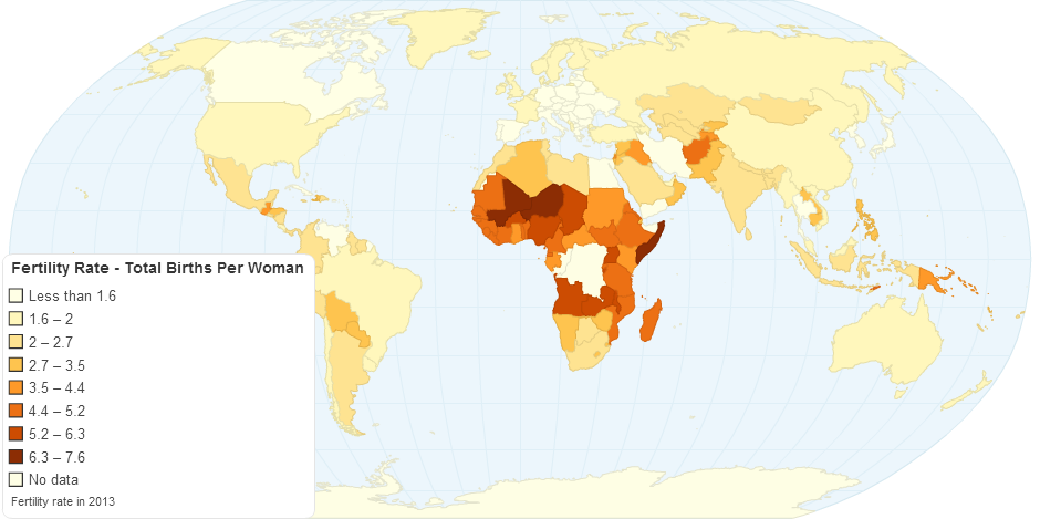 The map shows the fertility rate of countries. Also you can find data of development in four years (2010-2013) and rank of each country.