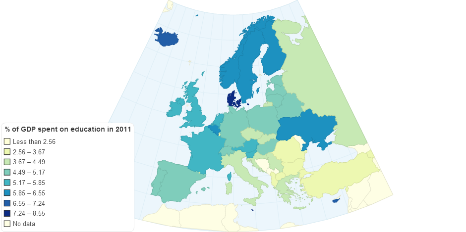 Map shows public expenditure on education in 2011 (for Greece, Russia, Turkey, Luxembourg and Ukraine I had to use older data). Rank of each country can be found in tooltip.
