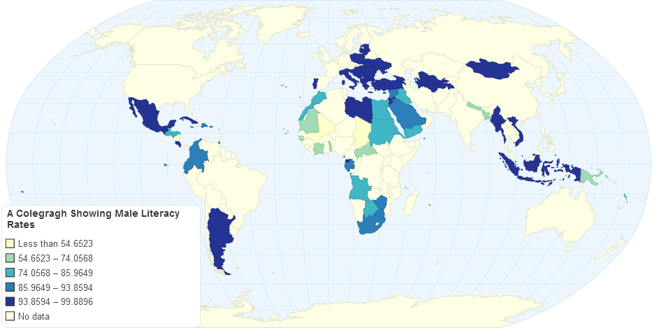 A Corepleth map showing male literacy rates on a map of the world. Literacy rates are especially high in the North.