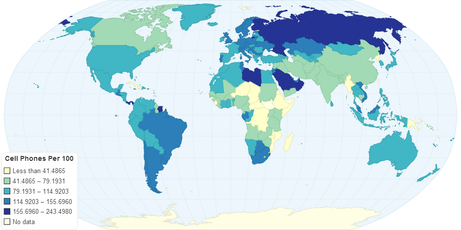 A map showing the amount of cell phones a country has per 100 people.