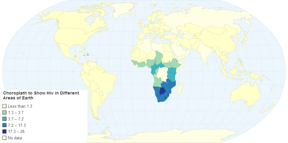 This chloropleth shows the distribution of HIV in different areas of the earth. This occurs more frequently in the southern region of africa. on the contrary, this occurs the least in central Europe.