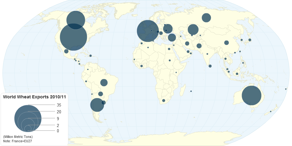 World Wheat Exports 2010/11 (marketing years) in million metric tons. Total exports 131.1 million metric tons.