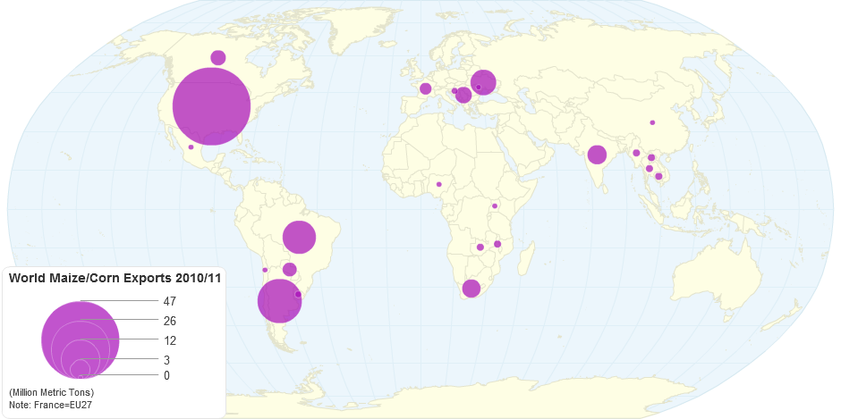 World Maize/Corn Exports 2010/11 (marketing years) in million metric tons. Total exports 89.4 million metric tons.