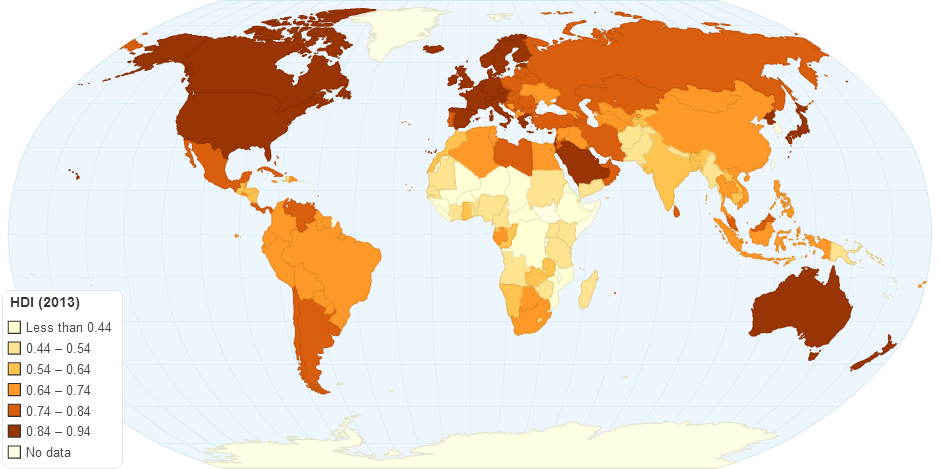 Comparison of 2013 Human Development Index (HDI) across the globe.