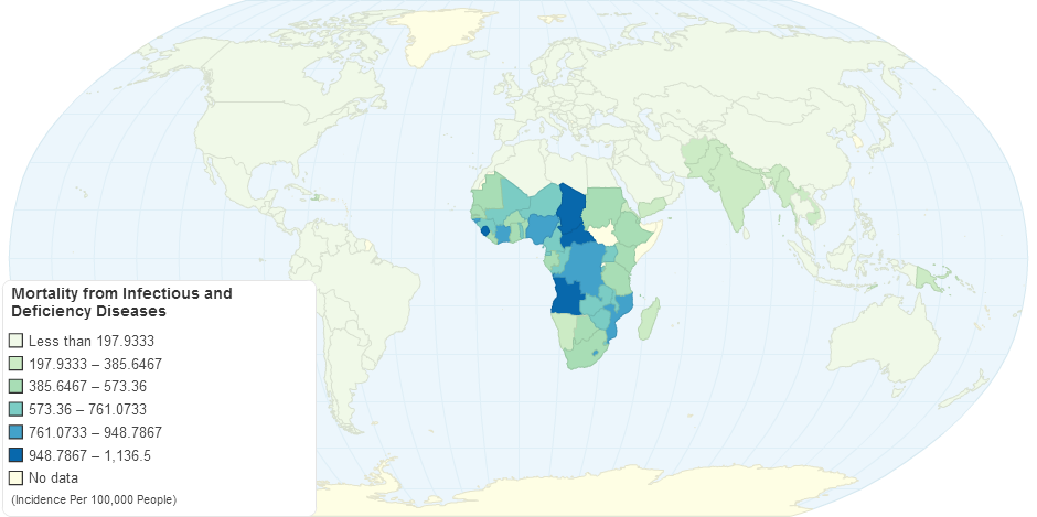 Mortality from Infectious and Deficiency Diseases (incidence per 100,000 people), Manipulated from original data source: WHO, May 2014 Release. Estimated deaths ('000) by cause, sex and WHO Member State (1), 2012, viewed 8th October, 2015.