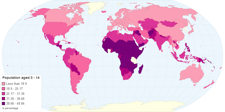 This chart shows percentage of population aged 0 - 14 by country in 2015.