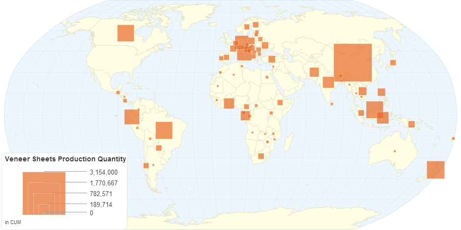 This chart shows the Veneer Sheets Production Quantity by country.