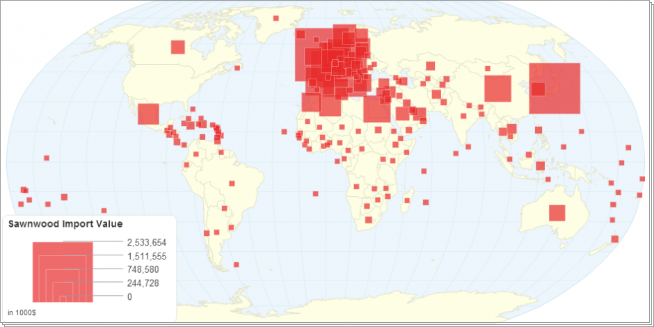 Sawnwood imports jumped 49 percent in volume and 67 in value. .Export prices for sawnwood from Cameroon kept mostly the previous month's level of around 746 USD/m3.