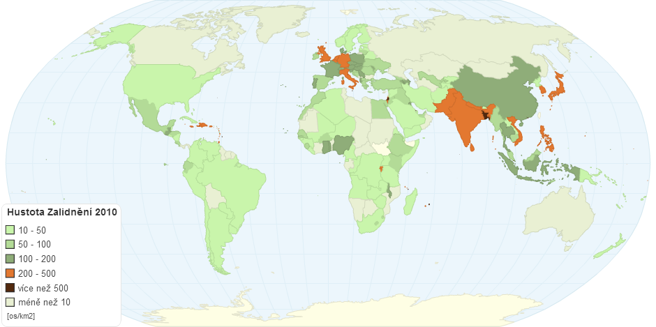 Hustota zalidnění jednotlivých států světa vyjádřená počtem osob na kilometr čtvereční.