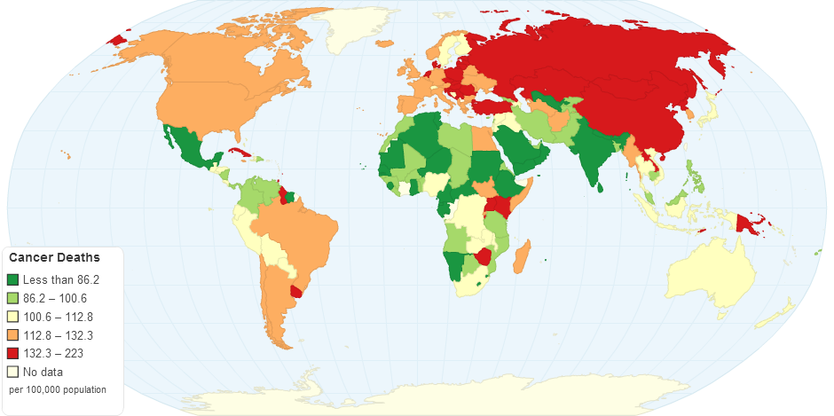 This chart shows the Cancer Deaths per 100,000 population by country.