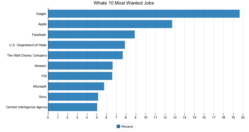 Consulting firm Universum asked some 6,700 young professionals with one to eight years of work experience to choose their ideal employers from a list of firms. Here's the percentage of respondents that chose each company. This is the 10 most wanted jobs out of 150 companys.