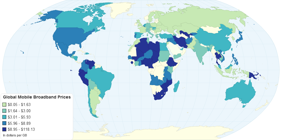 This chart shows the Global Mobile Broadband Prices ($/GB) by country.