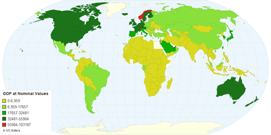 This chart shows The Gross Domestic Product at Nominal Values by country.