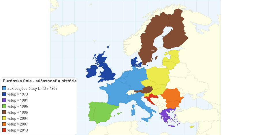 Mapa zobrazuje proces rozširovania EÚ od vzniku jej predchodcu EHS (Európske hospodárske spoločenstvo) až do jej súčasnej podoby.