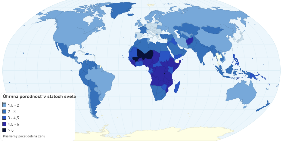 Mapa zobrazuje priemernú úhrnnú pôrodnosť v jednotlivých štátoch sveta pre rok 2015.
