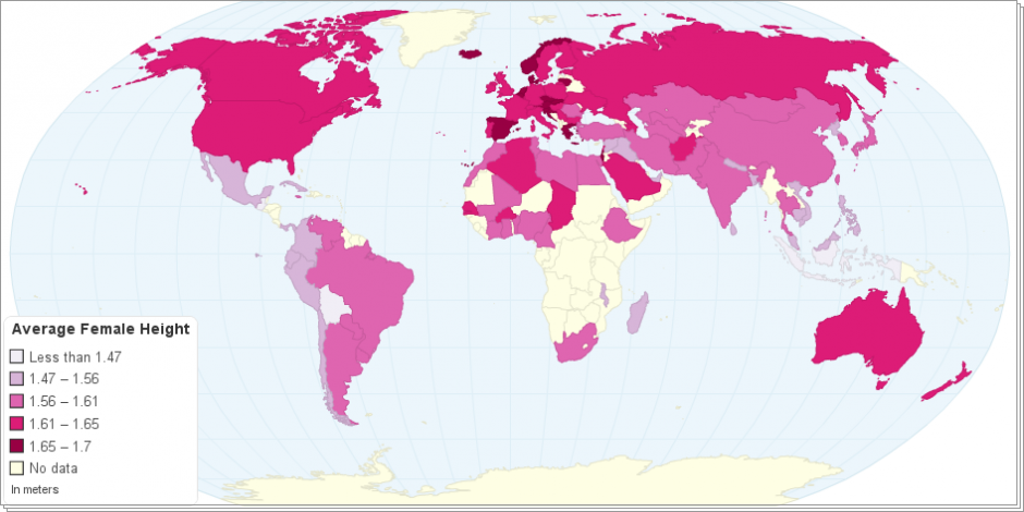 This map shows the Average Male and Female Heights by Country. Human height or stature is the distance from the bottom of the feet to the top of the head in a human body, standing erect. It is measured using a stadiometer, usually in centimetres when using the metric system, or feet and inches when using the imperial system. When populations share genetic background and environmental factors, average height is frequently characteristic within the group. Exceptional height variation (around 20% deviation from average) within such a population is sometimes due to gigantism or dwarfism, which are medical conditions caused by specific genes or endocrine abnormalities. Height is considered an indication of a country's well-being. As the economy increases, so does the average height of the population. Wealth tends to improve nutrition and medical care. This enables younger people to reach their maximum growth potential and as a result to live longer.