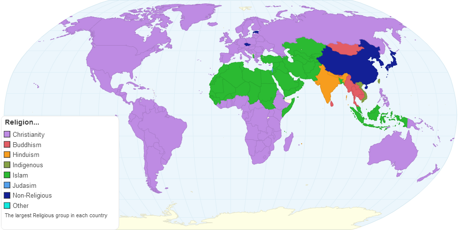1.Abrahamic religions are the largest group, and these consist mainly of Christianity, Islam, Judaism and the Bahá'í Faith. They are named for the patriarch Abraham, and are unified by the practice of monotheism. Today, around 3.4 billion people are followers of Abrahamic religions and are spread widely around the world apart from the regions around East and Southeast Asia. Several Abrahamic organizations are vigorous proselytizers.
