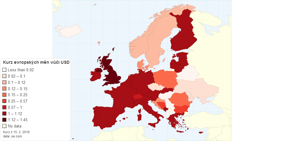 Kurz evropských měn vůči dolaru • zaokrouhleno na setiny • kurz k 15. 2. 2015 • xe.com