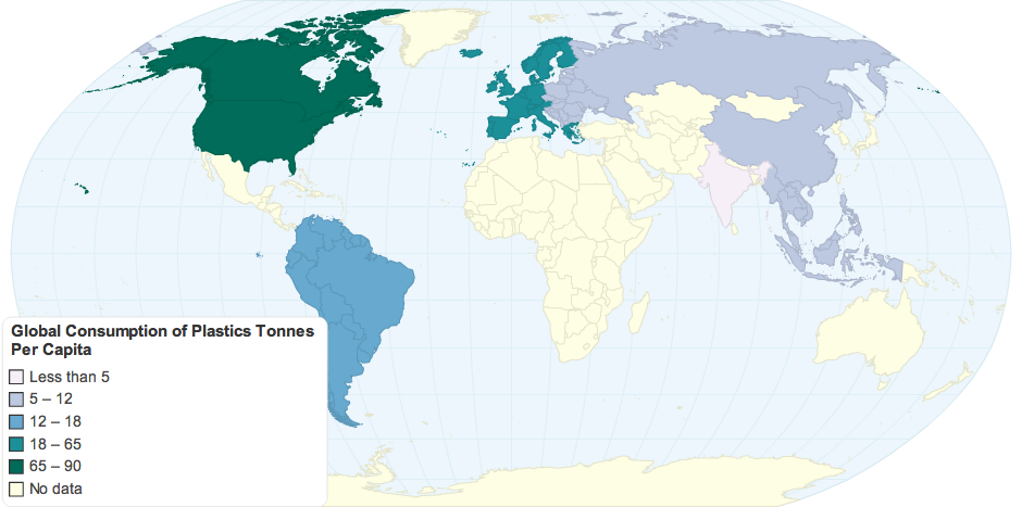 This is a map showing the Global Consumption of Plastics (Tonnes Per Capita)