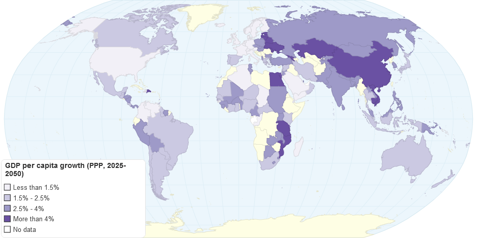 GDP per capita growth (PPP, 2025-2050), Jean FOURE, Agnès BENASSY-QUERE & Lionel FONTAGNE (2010), The world economy in 2050: a tentative picture, CEPII Working paper 2010-27., viewed 21st November, 2011.