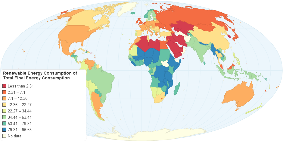 This map shows the renewable energy consumption of total final energy consumption worldwide