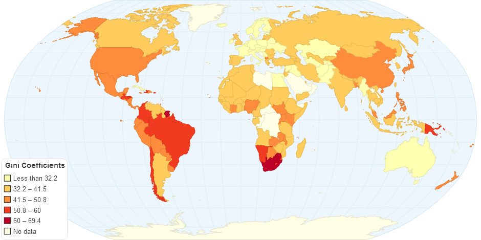 Last available Gini Coefficients for each country: data from UNU-WIDER, ‘World Income Inequality Database (WIID3.3)’