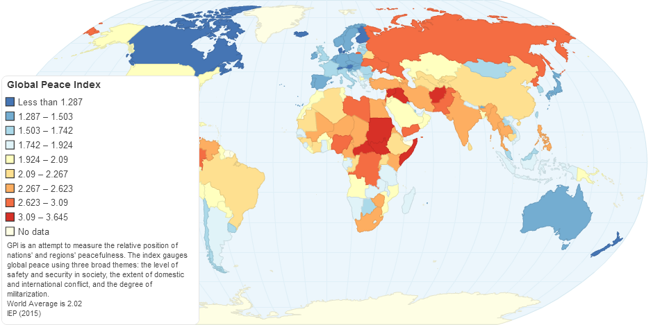 GPI is an attempt to measure the relative position of nations' and regions' peacefulness. The index gauges global peace using three broad themes: the level of safety and security in society, the extent of domestic and international conflict, and the degree of militarization. Factors are both internal such as levels of violence and crime within the country and external such as military expenditure and wars.