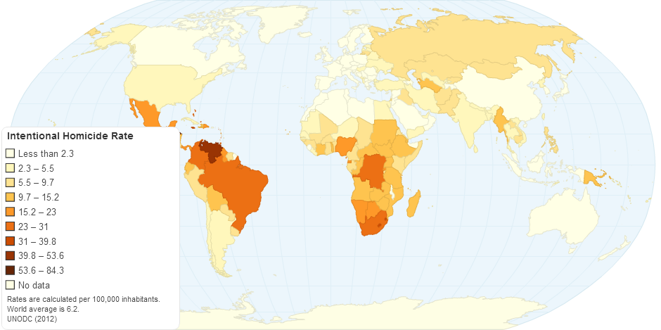 UNODC (United Nations Office on Drugs and Crime) reported a global average intentional homicide rate of 6.2 per 100,000 population for 2012 (in their report titled "Global Study on Homicide 2013").