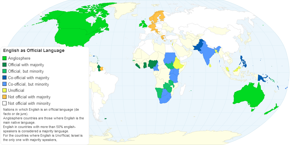 English in countries with more than 50% english-speakers are here considered being a majority language.