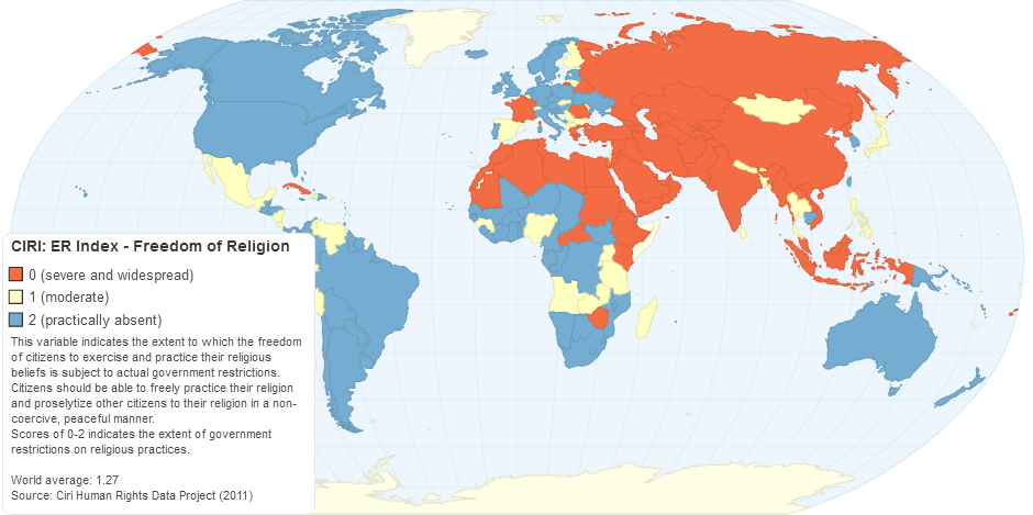 This variable indicates the extent to which the freedom of citizens to exercise and practice their religious beliefs is subject to actual government restrictions. Citizens should be able to freely practice their religion and proselytize other citizens to their religion in a non-coercive, peaceful manner.