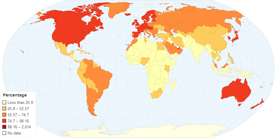 This is the illustration of the number of internet user per 100 people in each country