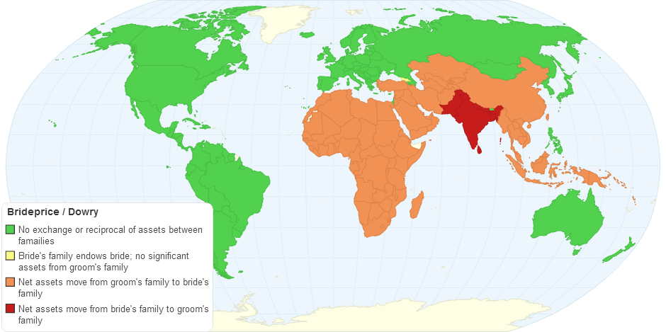 This chart shows Bride price / Dowry by Country.
