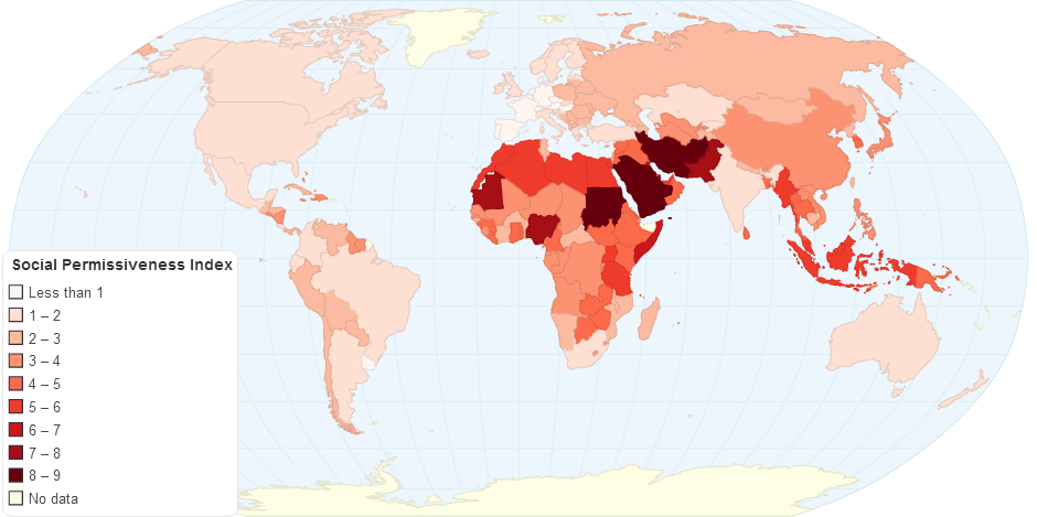 In order to determine how socially permissive a country is, I looked up the policies countries had on a few issues and gave them a point for each socially restrictive policy they had. Some received more than one point on a policy depending on how socially restrictive it was.