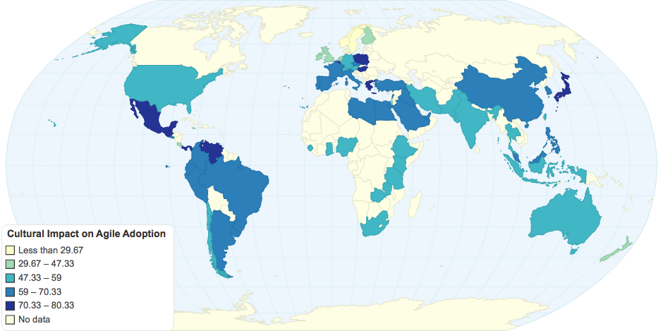 This chart illustrates the per-country average value of three of Geert Hofstede's culture index measurements: the power distance index, the masculinity index, and the uncertainty avoidance index. Alistair Cockburn suggested averaging these indices to estimate a "country cultural resistance to agile style work".