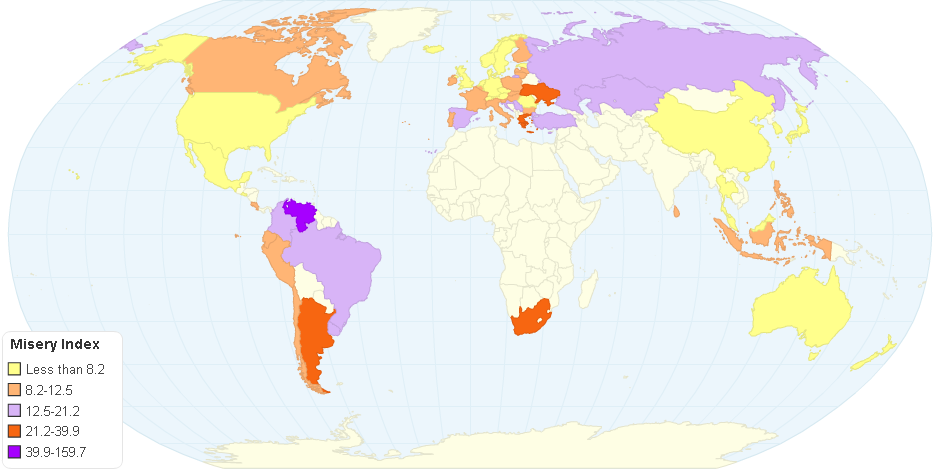 The ranking of 63 economies is compiled by adding a country's jobless rate and inflation, a long-standing calculation in which a higher score indicates more misery. Venezuela's 159.7 tally for the 2016 misery index done by Bloomberg quadruples the next-worst ranking Argentina.