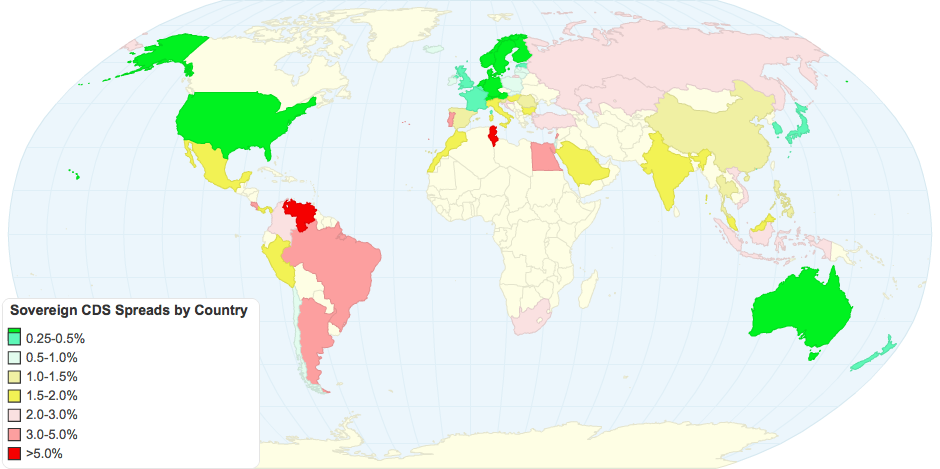Sovereign CDS spreads represent market-set prices for buyiing insurance against default. The spreads reported in this table are net of the Sovereign CDS spread for the US (0.44%).