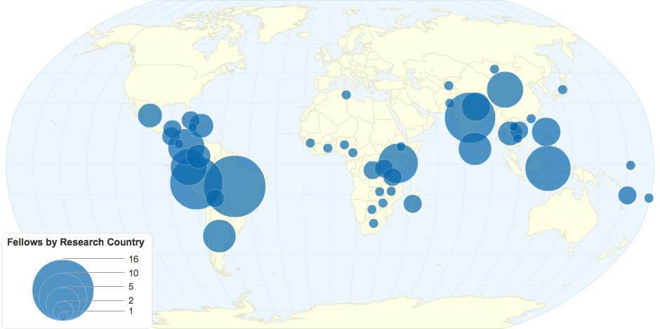 Research sites for Yale Tropical Resources Institute Fellows from 2012-present