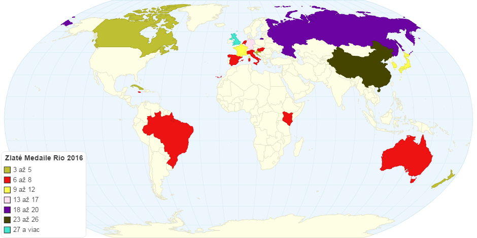 Mapa zobrazuje 20 štátov, ktoré mali na LOH Rio 2016 najviac zlatých medailí