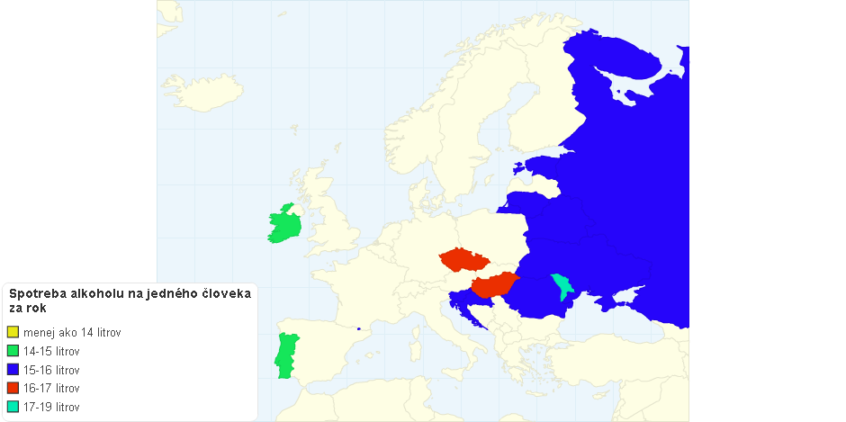 Mapa nám zobrazuje spotrebu alkoholu na jedného človeka za jeden rok