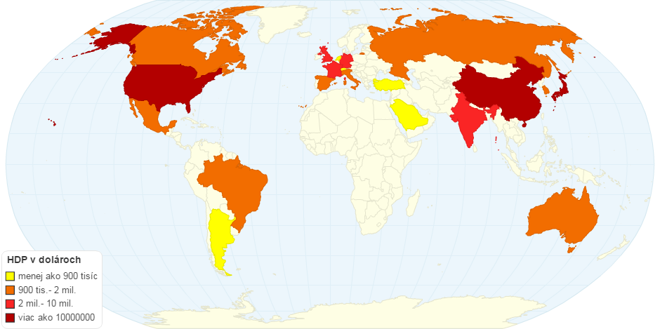 Mapa zobrazuje HDP ($) rôznych štátov.
