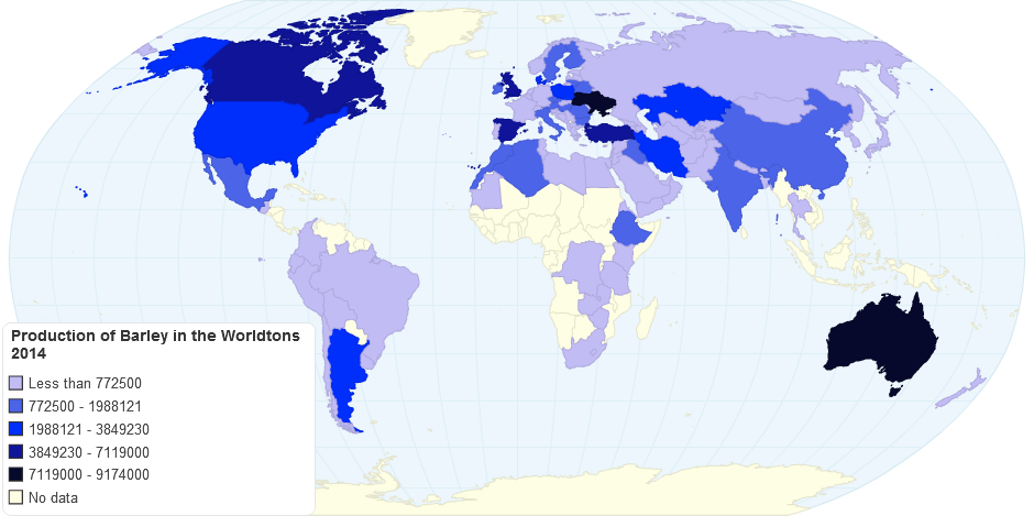 On this map, you can see a production of barley in the world. All data are in tons from year 2014
